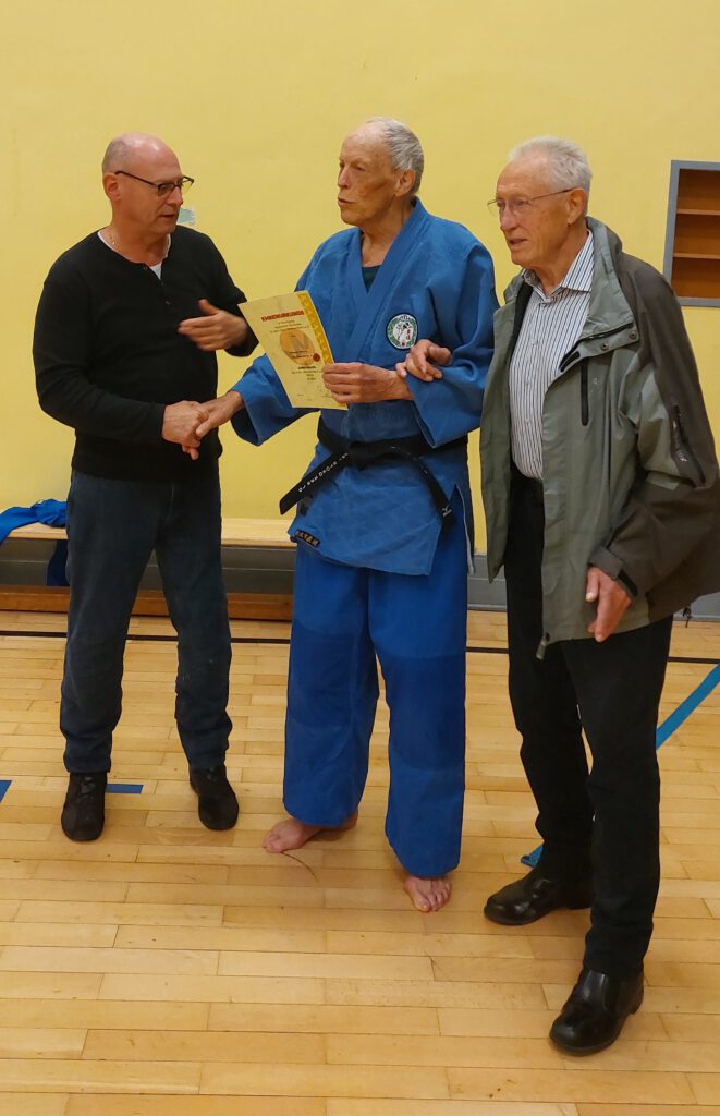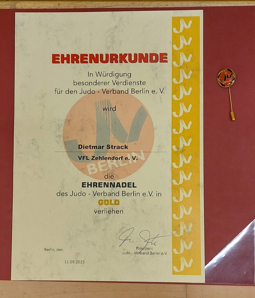 Der sichtlich überraschte Dietmar nahm die Auszeichnung nach der obligatorischen Laudatio im Beisein vom Manfred Künstler (8.Dan Judo), dem Jörg Bühler (1.Dan Judo) und seinen „Mädels“ vom Judowart des VfL Zehlendorf (Udo Strohe, 2.Dan Judo) entgegen.